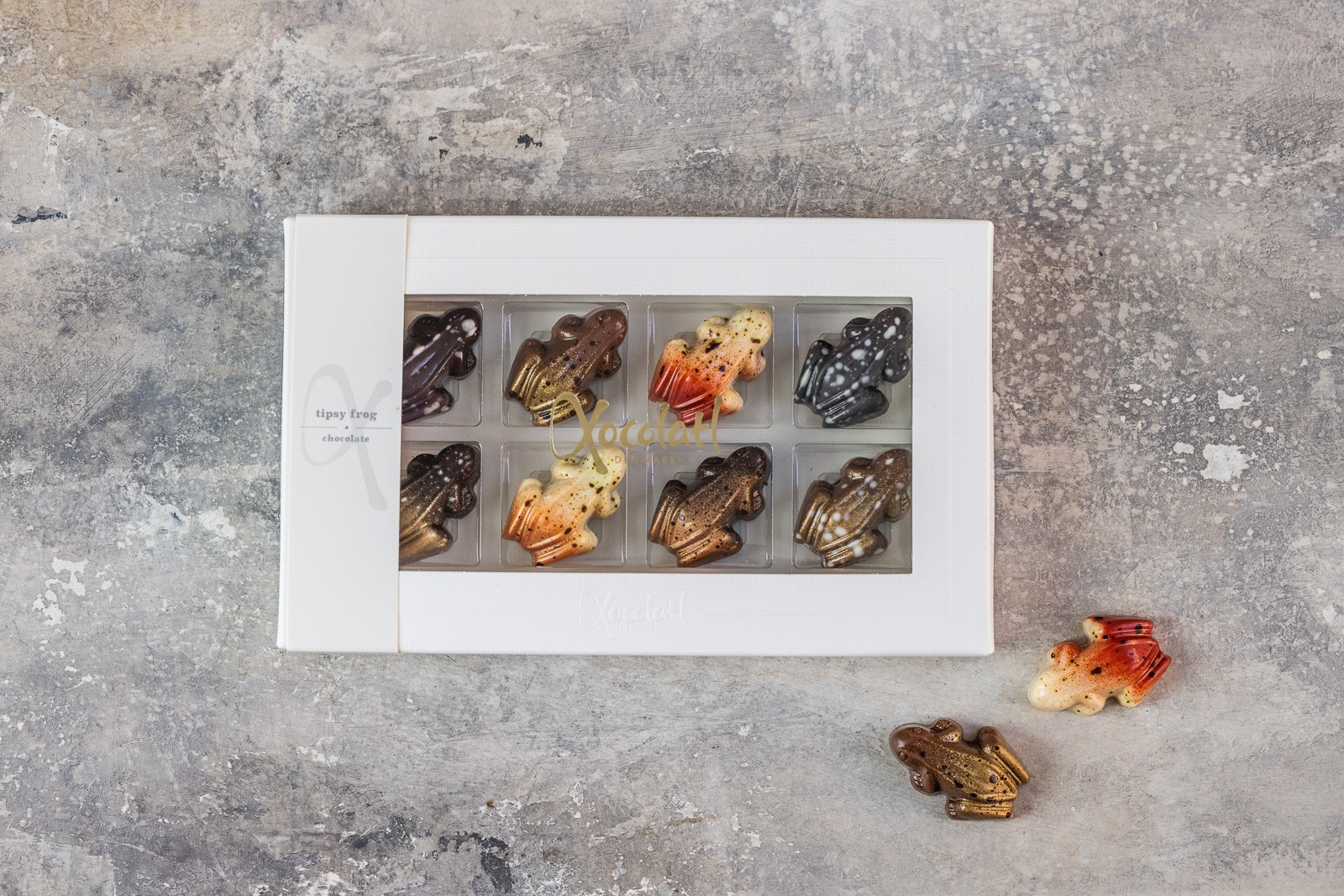 Made with sustainably sourced chocolate, these frogs are filled with delicate fruit purees and alcohol for the ultimate indulgence.